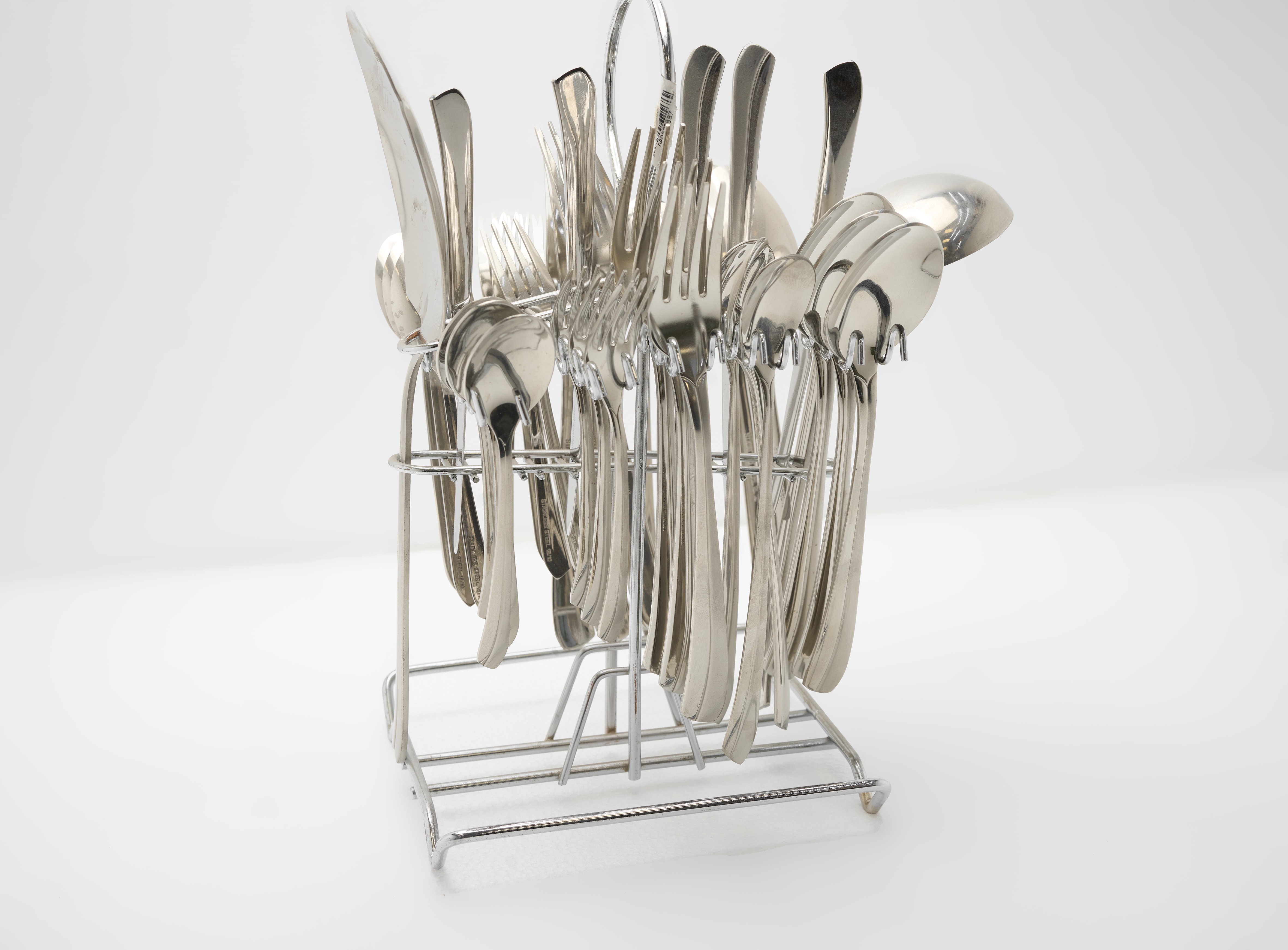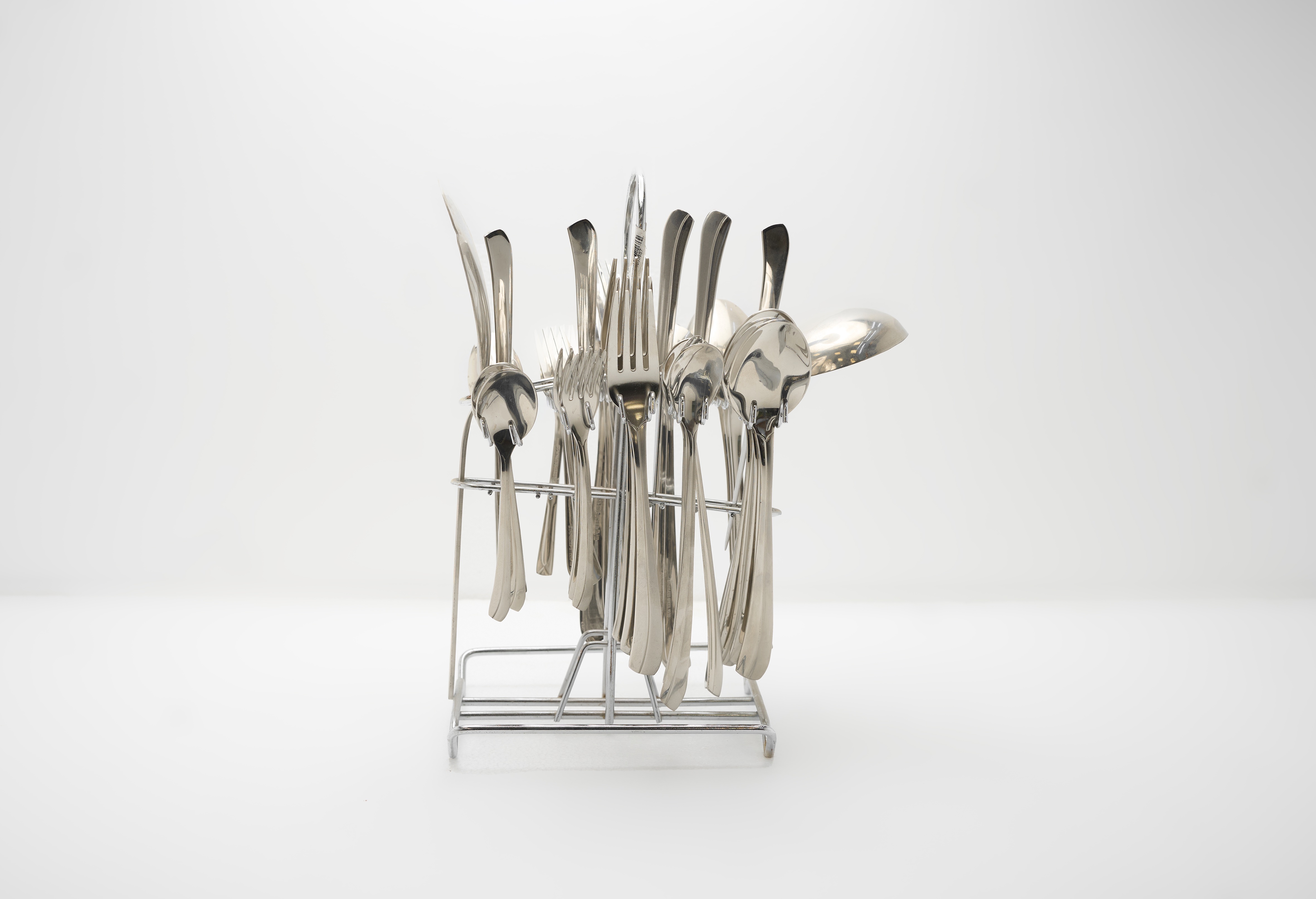 شامل 6 عدد قاشق، 6 عدد چنگال، 6 عدد کارد میوه خوری، 6 عدد چنگال میوه خوری، 6 عدد قاشق شربت خوری، 6 عدد قاشق چای خوری، 1 عدد ملاقه، 1 عدد کفگیر، 1 عدد استند