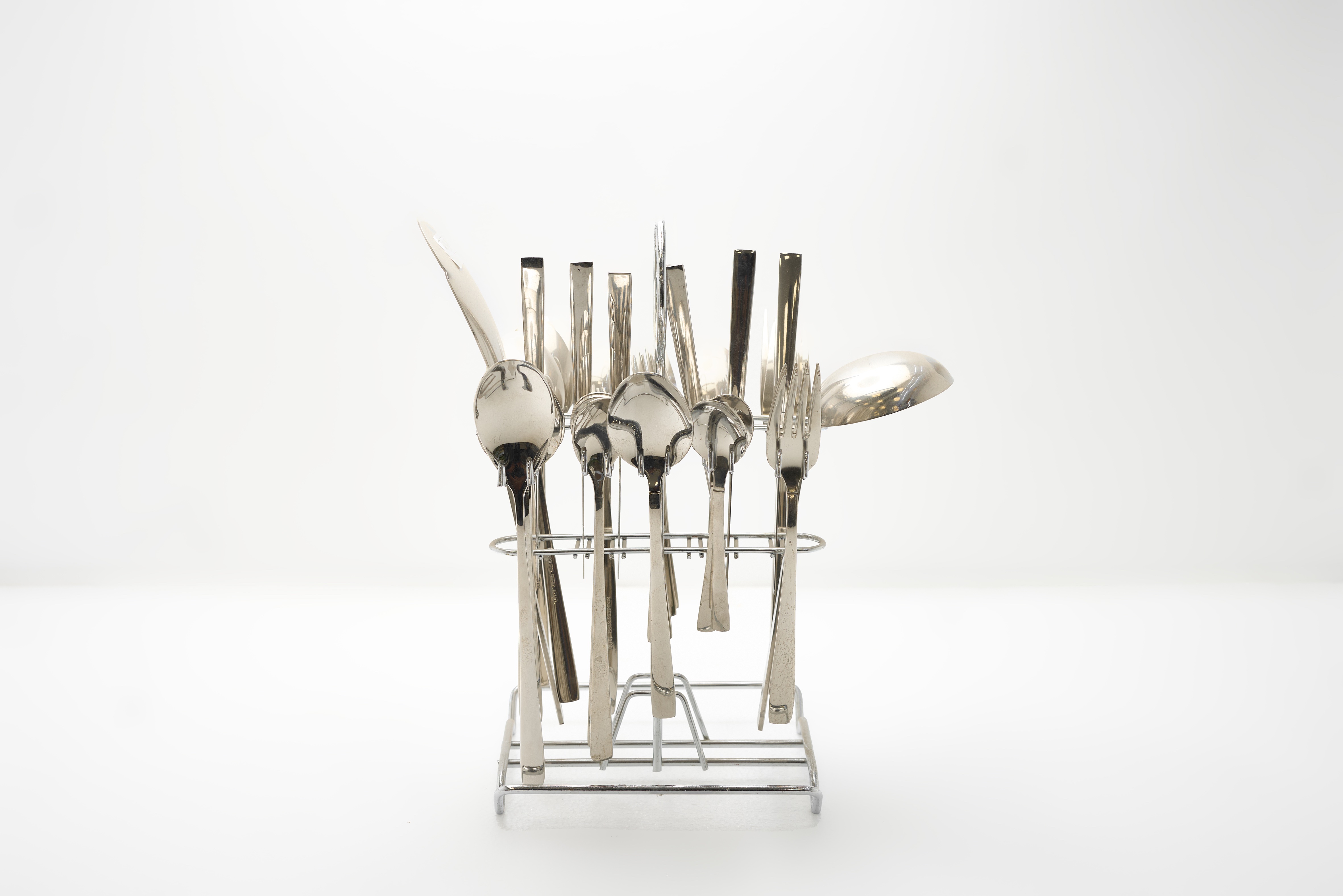 شامل 6 عدد قاشق، 6 عدد چنگال، 6 عدد کارد میوه خوری، 6 عدد چنگال میوه خوری، 6 عدد قاشق شربت خوری، 6 عدد قاشق چای خوری، 1 عدد ملاقه، 1 عدد کفگیر، 1 عدد استند