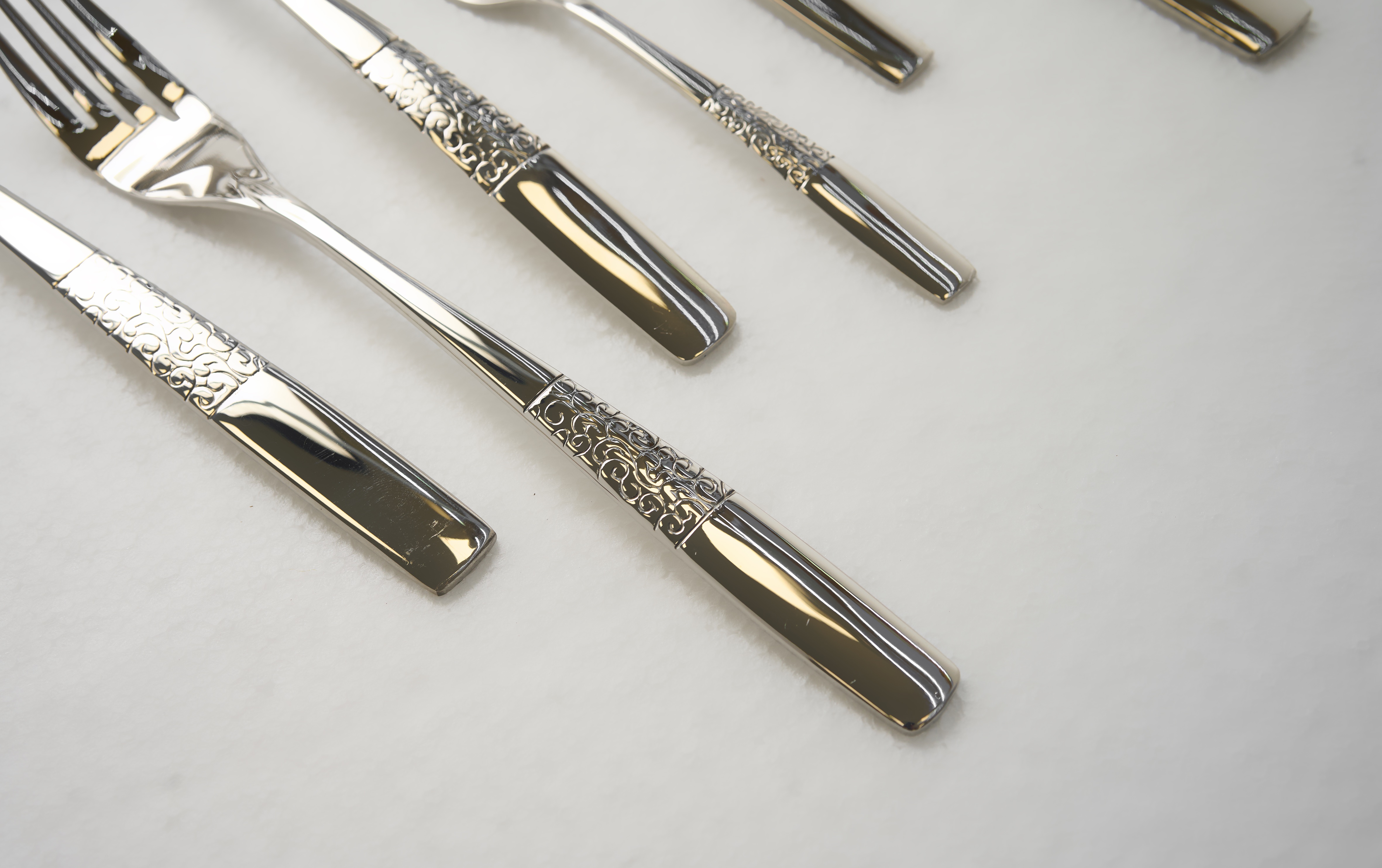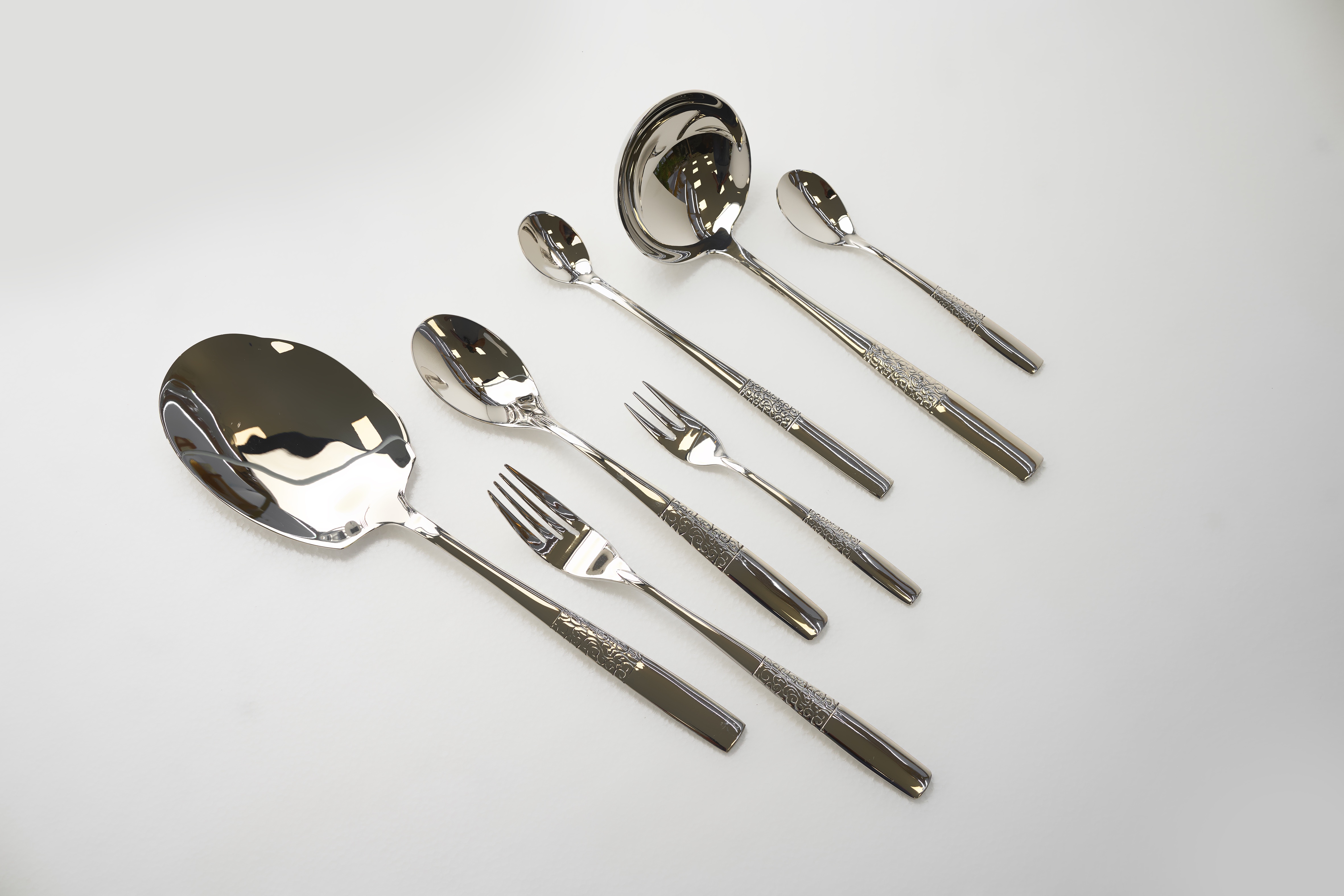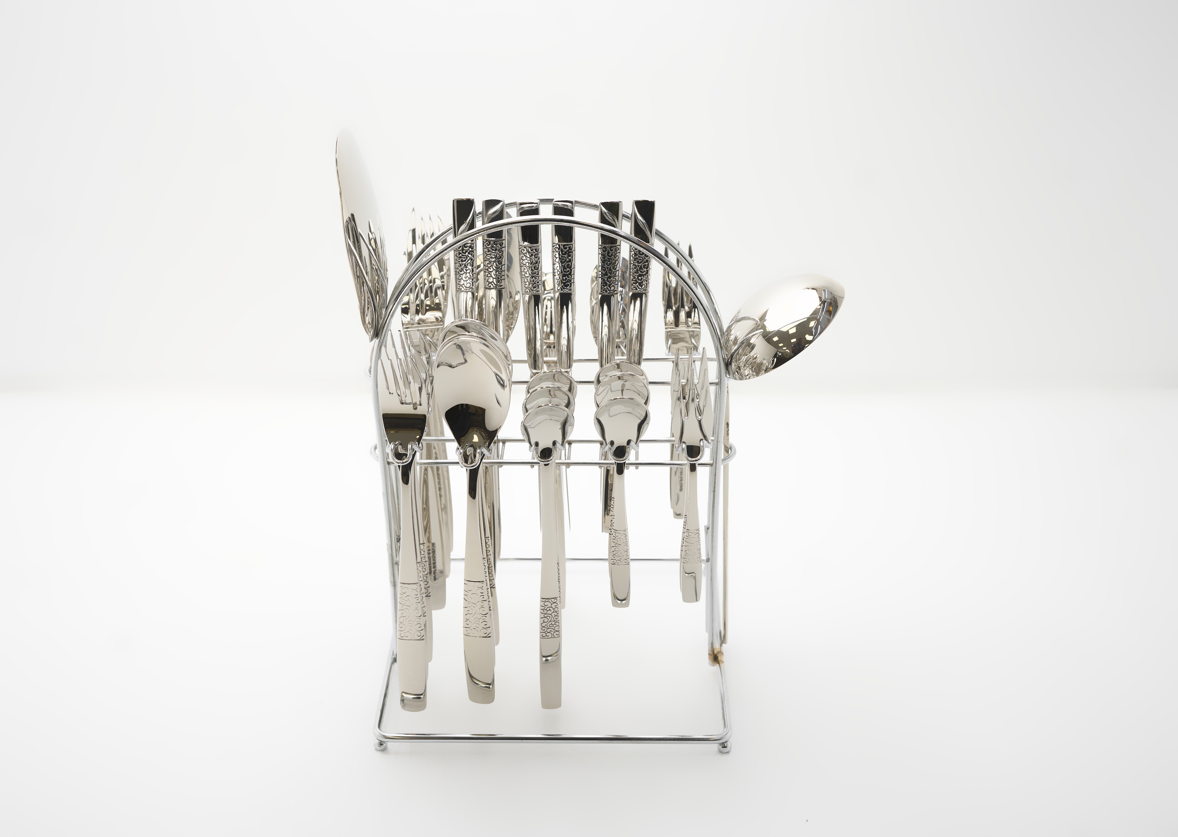 شامل 6 عدد قاشق، 6 عدد چنگال، 6 عدد کارد میوه خوری، 6 عدد چنگال میوه خوری، 6 عدد قاشق شربت خوری، 6 عدد قاشق چای خوری، 1 عدد ملاقه، 1 عدد کفگیر، 1 عدد استند